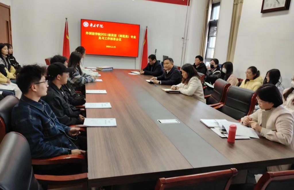 为扎实推进师范生教育见习,稳步开展英语专业师范认证工作,3月19日下午,党委书记盛清银、院长韩健侠、副书记肖玉刚等为2021级英语专业(师范类)的34名学生召开了见习部署工作会议。会上,盛清银代表学院对本次见习的学生在端正态度、树立形象、提高技能、攻坚克难等方面提出了具体要求。韩建侠指出了见习工作的重要意义,勉励参加见习的学生该珍惜机会、潜心学习、不怕吃苦、加强研究。