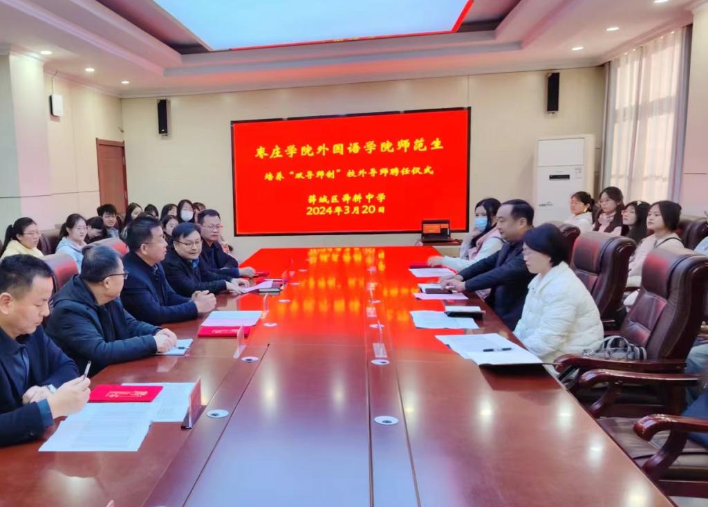3月20日上午,副院长孙显云及负责实习的三名指导老师一起带领2021级英语专业(师范类)学生赴枣庄市薛城区舜耕中学,双方召开见习见面座谈会暨永利集团248cc登录师范生培养“双导师制”校外导师聘任仪式。舜耕中学党委书记于保龙,副校长黄礼成、于保恒、刘陵全、褚衍伟等参加了座谈会。座谈会上,孙显云主要介绍了本次见习活动的目的和参加见习学生的基本情况,并就重点任务等进行安排部署。随后,永利集团248cc登录与舜耕中学举行了师范生培养“双导师制”校外导师聘任仪式,孙显云为舜耕中学校外指导教师颁发了聘任证书。最后,于保龙对本次见习见面座谈会进行了总结,对即将开展见习活动的学生提出了殷切希望。