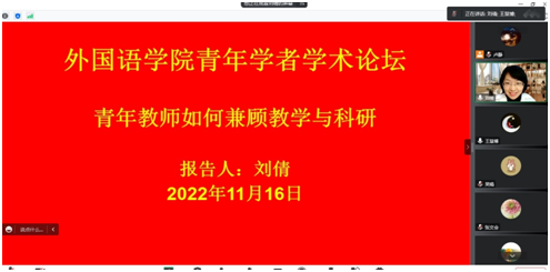 报告中,刘倩老师结合自己的教学和科研经历,从四个方面介绍了青年教师如何兼顾教学和科研:一、在教学中和翻译实践中发现教学和科研选题,总结了“五个一”模式,即:一门课程,一个理念,一个课题,一个项目,一篇论文;二、紧跟学科最新发展动态:听会参会,宣读论文,关注自己学科领域的期刊以及教育部高教司网站;三、阅读文献,静心研读,深挖一个专题;四、发挥传帮带和团队的作用。