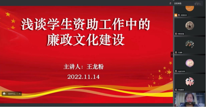 为进一步弘扬廉政文化,树立廉洁理念,推动廉政文化向纵深发展,11月14日晚,永利集团248cc登录通过“腾讯会议”网络平台举办廉政文化建设主题讲座。本次讲座由永利集团248cc登录专职辅导员王龙粉主讲,永利官网400余名学生聆听了此次讲座。