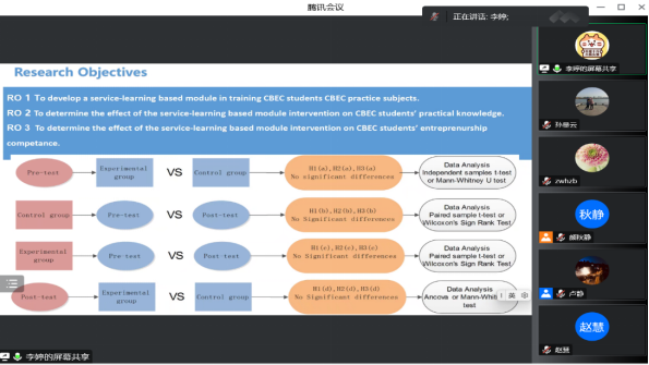 报告中,李婷结合自己博士期间的研究,将服务学习理论引入跨境电子商务专业传统教学中,基于服务学习理论和建构主义理论,开发服务学习模式,采用准试验研究方法,研究新模式对跨境电子商务大学生实践知识和创业胜任力的影响。