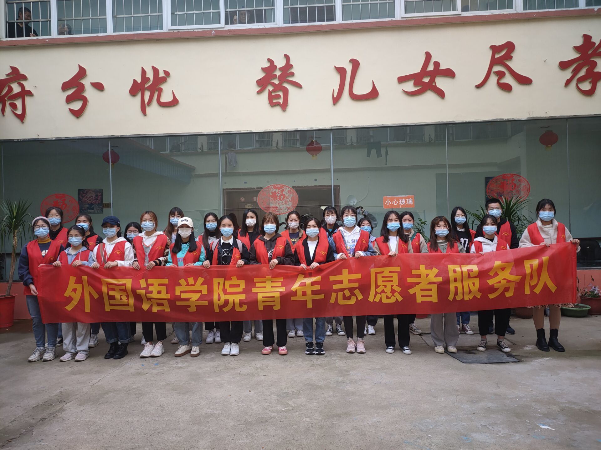 志愿者为敬老院老人们带去了慰问品,受到了敬老院领导和老人们的热烈欢迎。在敬老院,志愿者与老人聊天,听老人们讲述他们年轻时的故事,同时把自己身边的趣事分享给他们。随后,志愿者帮老人们打扫卫生、整理内务、清理垃圾。最后,志愿者为老人们献上精心准备的大合唱《国家》、《外婆的澎湖湾》等歌曲,并展示了轻快活泼的手语舞蹈,精彩纷呈的节目令老人们拍手称赞。