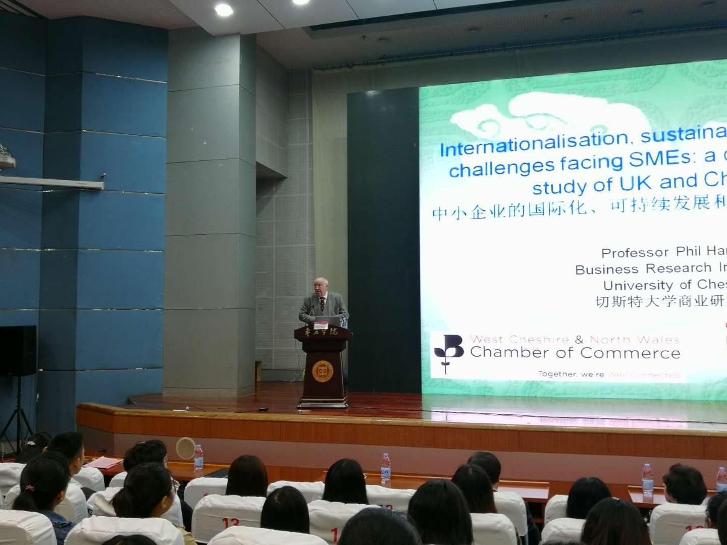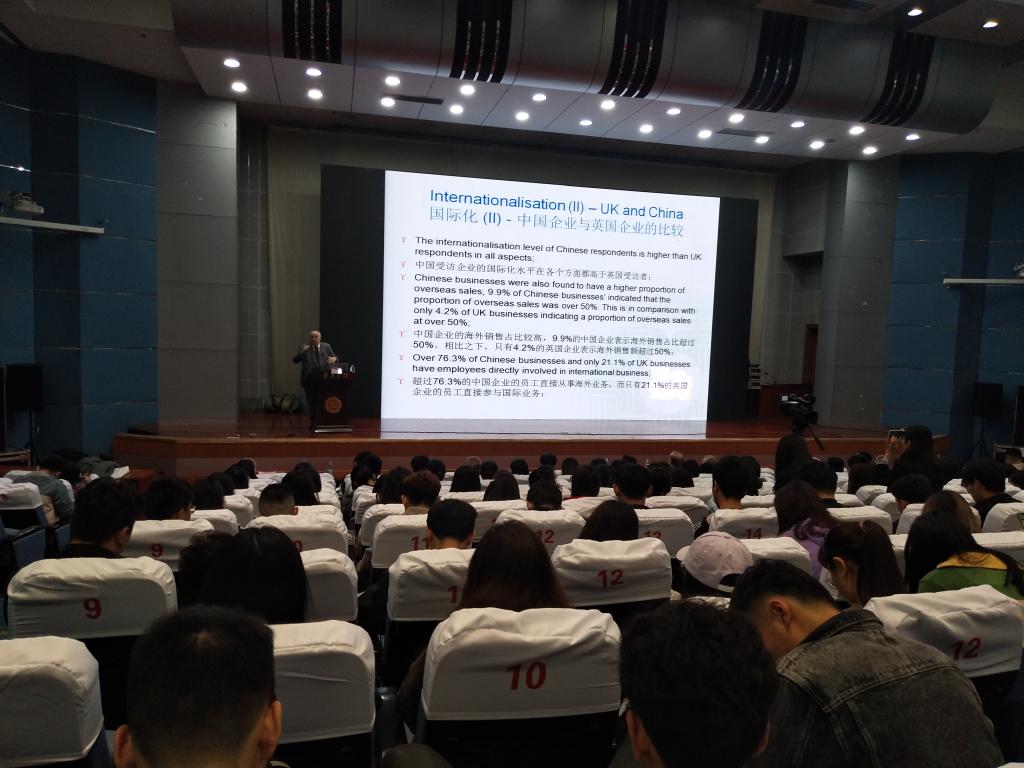 4月8日上午,切斯特大学商务研究院院长Phil Harris教授应邀在综合楼学术报告厅为永利集团248cc登录、经济与管理学院师生做了一场题为 “Internationalisation,Sustainability and Key Challenges Facing SMEs: A Comparative Study of UK and China”的学术报告。切斯特大学校长Tim Wheeler 和夫人Marilyn Wheeler、Phil Harris夫人Irene Harris、切斯特大学中国区事务主任徐进、江苏大学管理学院留学生博士生导师龙兴乐、国际合作与交流处处长盛清银、经济与管理学院院长刘振宇以及外院与经济与管理学院200余名师生参加了报告会。报告会由永利集团248cc登录副院长褚夫敏主持。