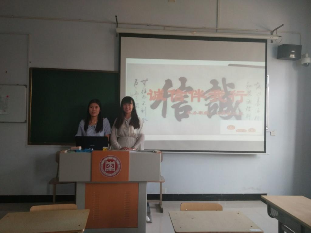 班会上,学生们一起探讨了什么是诚信,并讲解了立木为信、烽火戏诸侯等有关诚信的故事。短剧《考试风波》形象地展示了当前大学生诚信的缺失以及加强诚信教育的重要性。接着,全体同学起立,庄严地进行诚信宣誓。随后,晁书记鼓励同学们分享了发生在自己身边的一些关于诚信的真实案例,并结合“假孕妇求让座”、“毕业生入传销组织”等亲身经历,晁书记讲述了考试作弊、论文抄袭、简历注水、逃火车票等当前大学生诚信缺失的现象,号召同学们要重视诚信这一中华民族传统美德,树立诚信做人的良好作风。