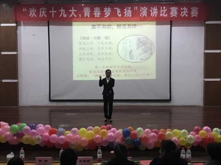 经过初赛的激烈角逐,共有10位选手脱颖而出进入决赛。比赛过程中,选手们以饱满的热情,激昂的语言,热情讴歌了中国共产党人崇高的理想信念。王文政同学在《欢庆十九大,坚定航天梦》中,结合自己在航天部队当兵的亲身经历,深情并茂地讲述了中国的航天梦是怎样一段曲折奋斗的历程。童莎莎同学在《不忘初心,继续前行》中引用百岁仁医胡佩兰连续坐诊20年,风雨无阻的事迹歌颂中国共产党全心全意为人民的‘赤子之心’,激励广大青年不忘初心,树立远大理想;刘亚茹同学在《欢庆十九大,不忘初心跟党走》中讲述了党的干部焦裕禄身患肝癌,仍坚持为人民服务,与兰考的自然灾害顽强斗争的感人事迹。最后,院党总支副书记黄成亮老师对本次比赛进行点评,从准备态度、演讲节奏等方面肯定了选手们的精彩表现,同时也指出其存在的不足,鼓励同学们多关心国家时事。此次比赛桂冠由2017级商务英语专科一班的郭青同学摘得。