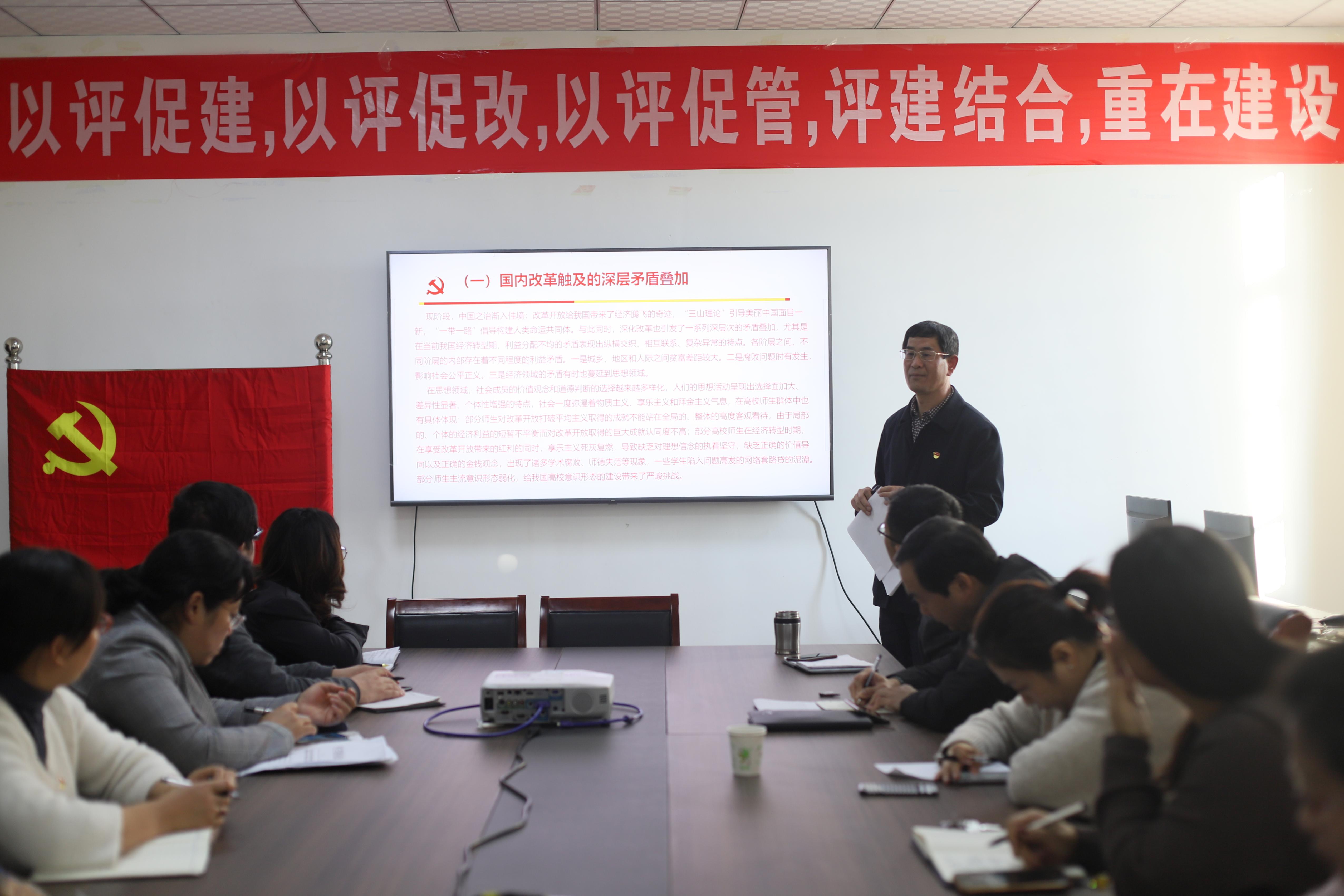 10月23日下午,永利集团248cc登录在文科楼309会议室开展意识形态专题党课教育活动,专题党课由学院党总支书记刘玉宝主讲,题目为《增强思想自觉和行动自觉,积极探索加强新时代高校意识形态安全建设的路径选择》,永利集团248cc登录部分教工党员和全体学生党员参加了此次专题党课教育活动。