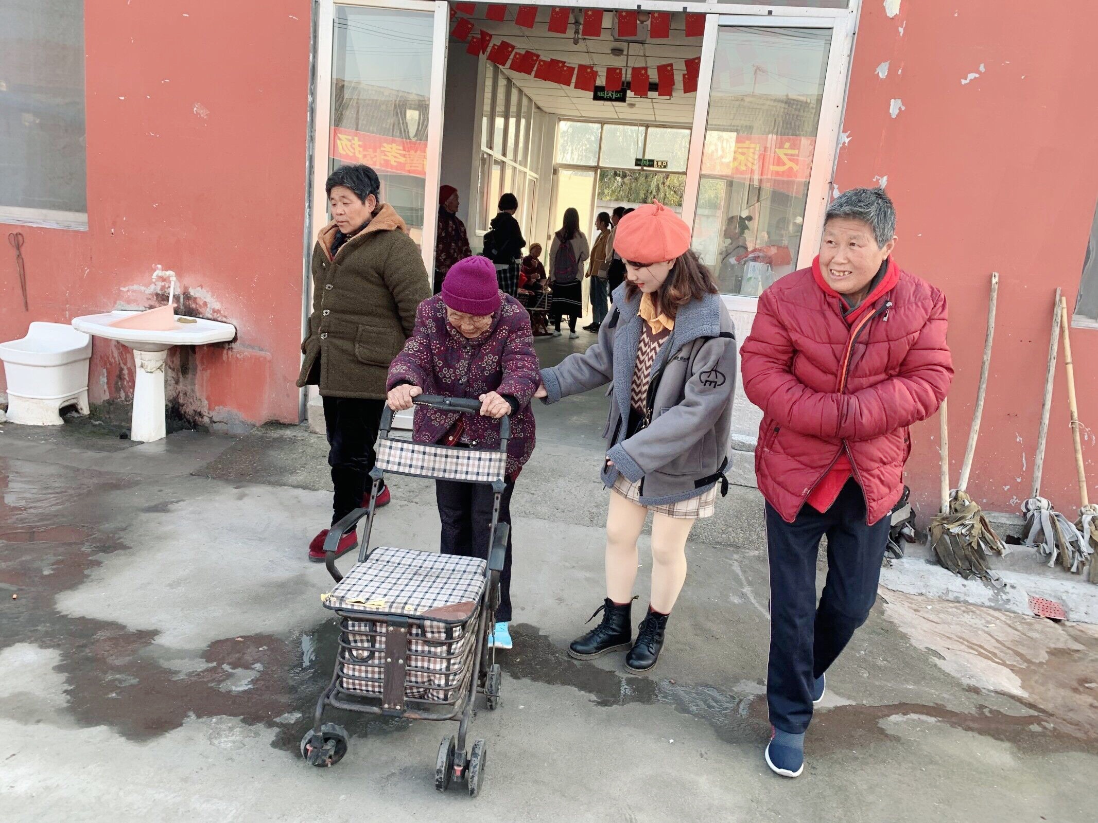 走进老年公寓,志愿者们就自觉分成几个爱心小分队,主动上前与老人们亲切地聊天,耐心询问他们的身体状况和生活情况,当看到有老人行动不便时,大家便上前搀扶老人行走......一句句温暖的话语,一声声细心的嘱咐,让老人们备感温暖。