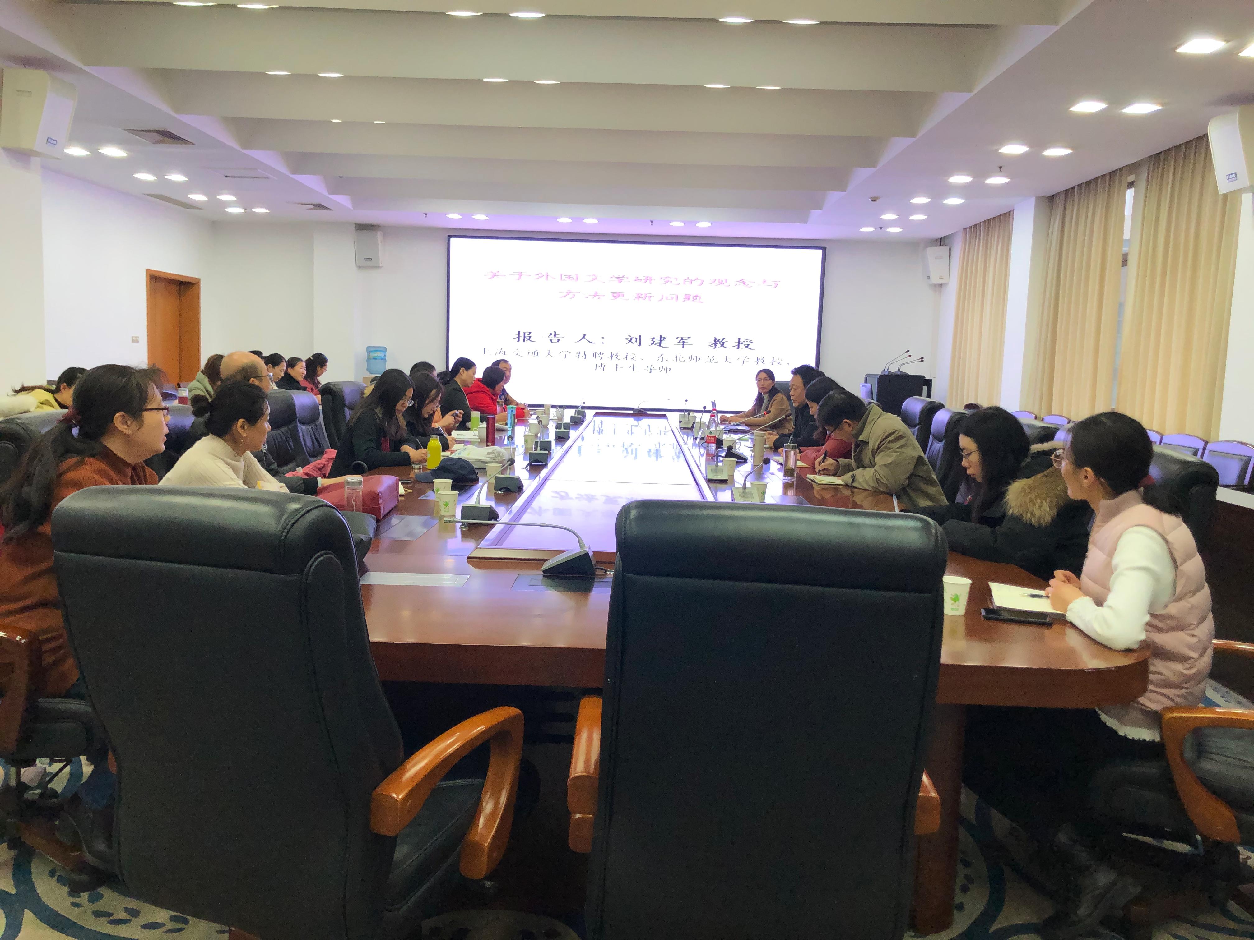 12月15日上午,永利集团248cc登录特邀上海交通大学特聘教授、东北师范大学教授、博士生导师刘建军在我校综合楼三楼会议室作了题为“关于外国文学研究的观念与方法更新问题”的学术报告。本次报告由永利集团248cc登录院长韩建侠主持,永利集团248cc登录、大学英语教学部、文学院六十余教师参加了报告会。