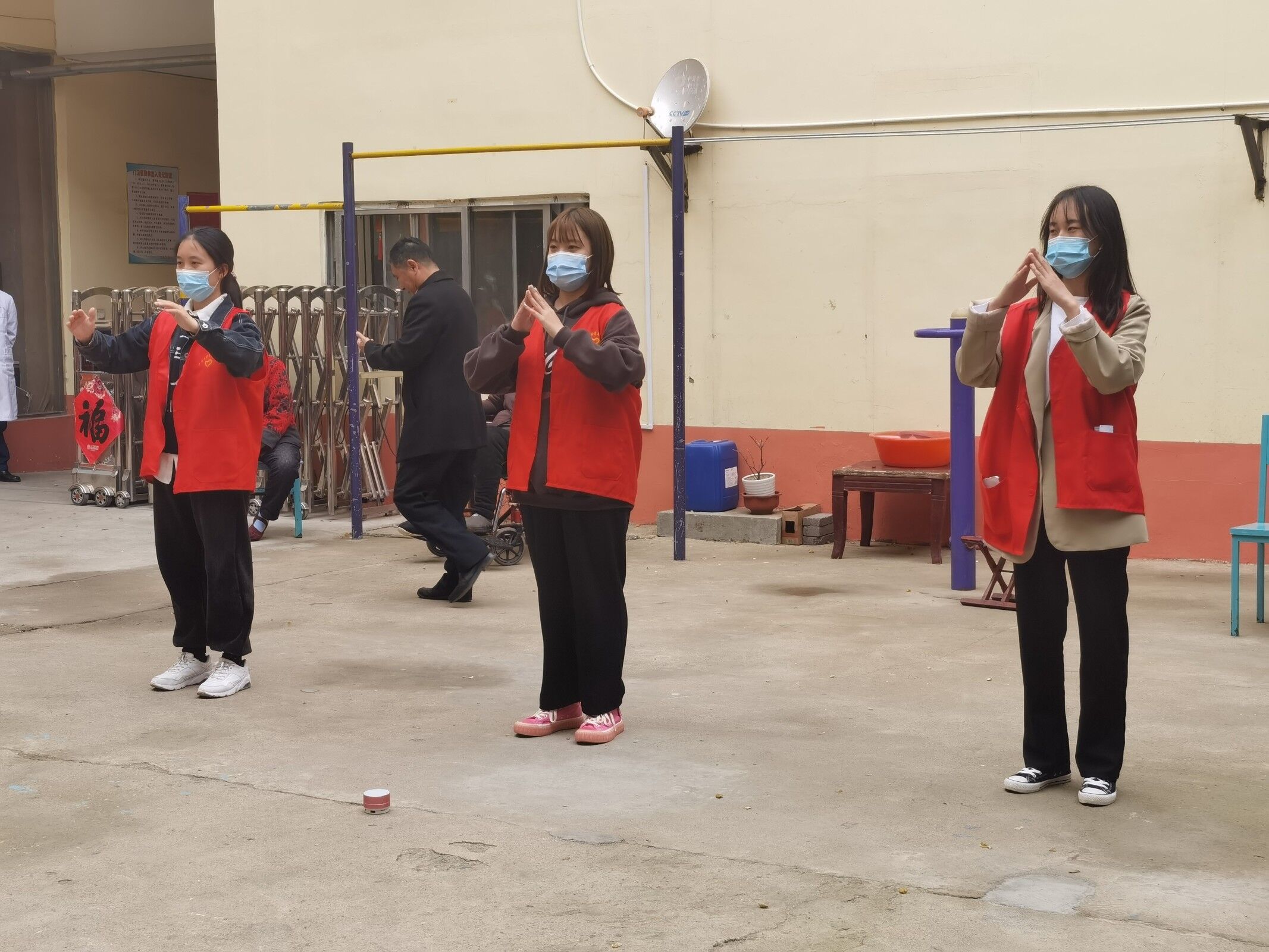 志愿者为敬老院老人们带去了慰问品,受到了敬老院领导和老人们的热烈欢迎。在敬老院,志愿者与老人聊天,听老人们讲述他们年轻时的故事,同时把自己身边的趣事分享给他们。随后,志愿者帮老人们打扫卫生、整理内务、清理垃圾。最后,志愿者为老人们献上精心准备的大合唱《国家》、《外婆的澎湖湾》等歌曲,并展示了轻快活泼的手语舞蹈,精彩纷呈的节目令老人们拍手称赞。