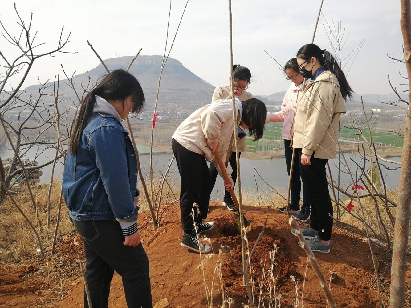 在植树现场,同学们分工明确, 配合默契,有人挥锹挖土,有人放苗扶正,有人填土压实,有人提桶浇水,呈现出一派热火朝天的景象。经过一下午的辛勤劳动,志愿者们共种下了七棵杨树苗。新栽的树苗迎风挺立,为三月增添了春色和生机。大家纷纷表示,这次植树活动不仅美化了环境,献出了一份绿色,同时也为自己种下了一颗爱心,一份希望。